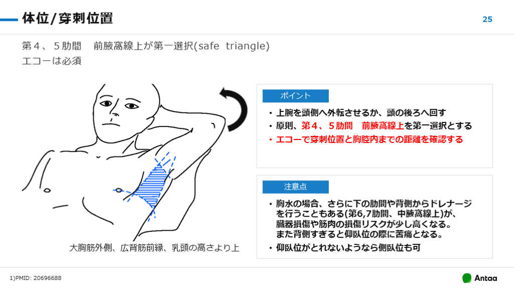 #25. 25 1)PMID: 20696688 体位/穿刺位置 第4、5肋間 前腋窩線上が第一選択(safe triangle)