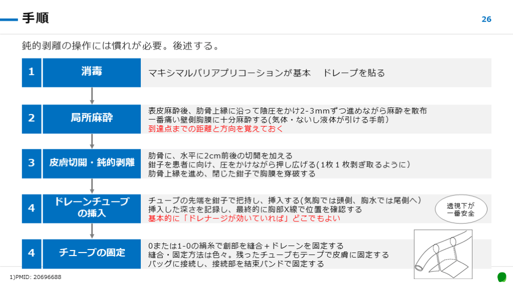 #26. 手順 鈍的剥離の操作には慣れが必要。後述する。 26 1)PMID: 20696688 消毒 マキシマルバリアプリコーションが基本 ドレープを貼る 局所麻酔 表皮麻酔後、肋骨上縁に沿って陰圧をかけ2-3mmずつ進めながら麻酔を散布