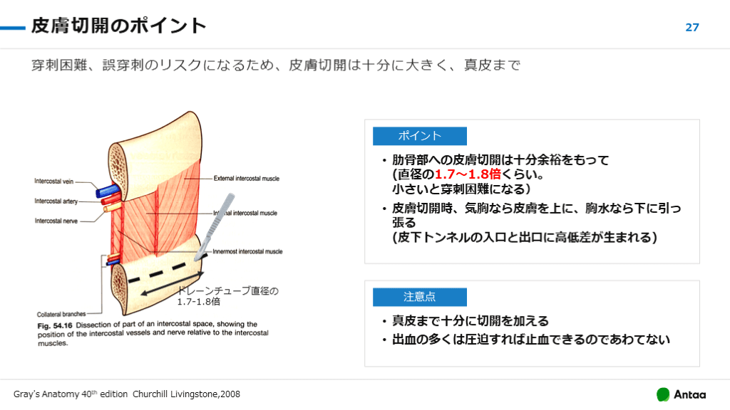 #27. 27 皮膚切開のポイント 穿刺困難、誤穿刺のリスクになるため、皮膚切開は十分に大きく、真皮まで 肋骨部への皮膚切開は十分余裕をもって (直径の1.7〜1.8倍くらい。小さいと穿刺困難になる)