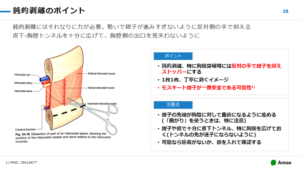 モスキート鉗子が一番安全である可能性1) ポイント 鉗子の先端が胸腔に対して垂直になるように進める(「曲がり」を使うときは、特に注意)
