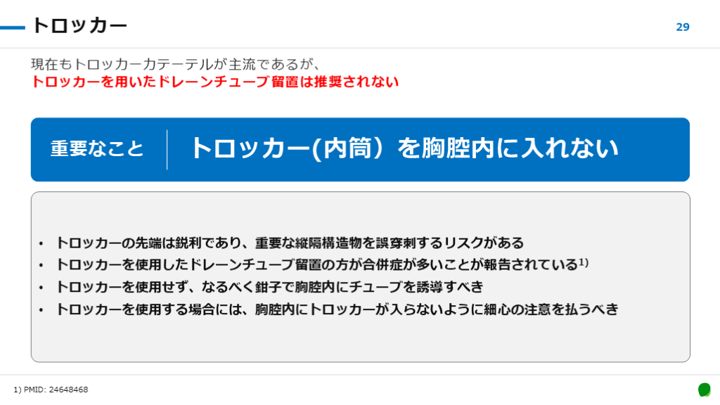 #29. トロッカー 現在もトロッカーカテーテルが主流であるが、トロッカーを用いたドレーンチューブ留置は推奨されない 29 1) PMID: 24648468 重要なこと トロッカー(内筒)を胸腔内に入れない トロッカーの先端は鋭利であり、重要な縦隔構造物を誤穿刺するリスクがある