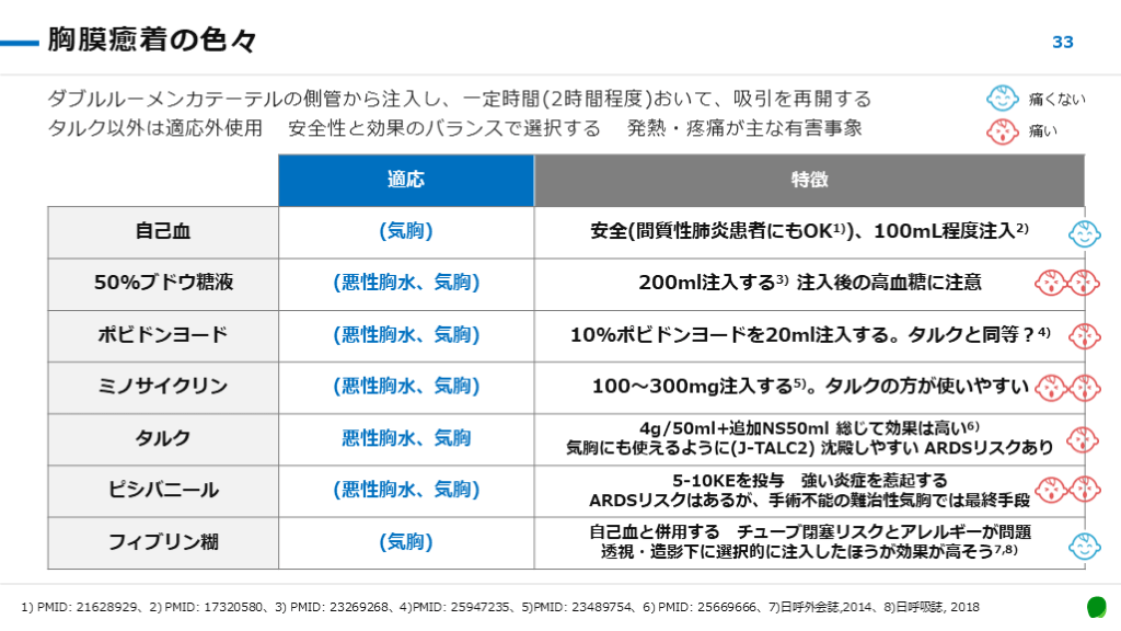 タルク以外は適応外使用 安全性と効果のバランスで選択する 発熱・疼痛が主な有害事象 33 1) PMID: 21628929、2) PMID: 17320580、3) PMID: 23269268、4)PMID: 25947235、5)PMID: 23489754、6) PMID: 25669666、7)日呼外会誌,2014、8)日呼吸誌, 2018 痛くない 痛い