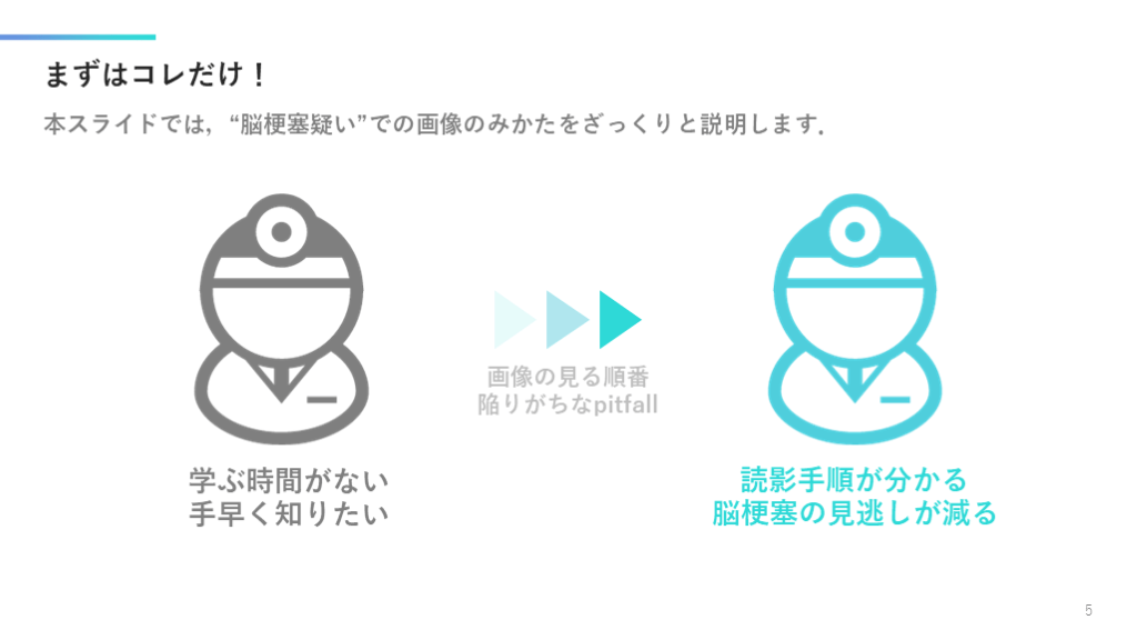 陥りがちなpitfall まずはコレだけ! 本スライドでは,“脳梗塞疑い”での画像のみかたをざっくりと説明します. 5