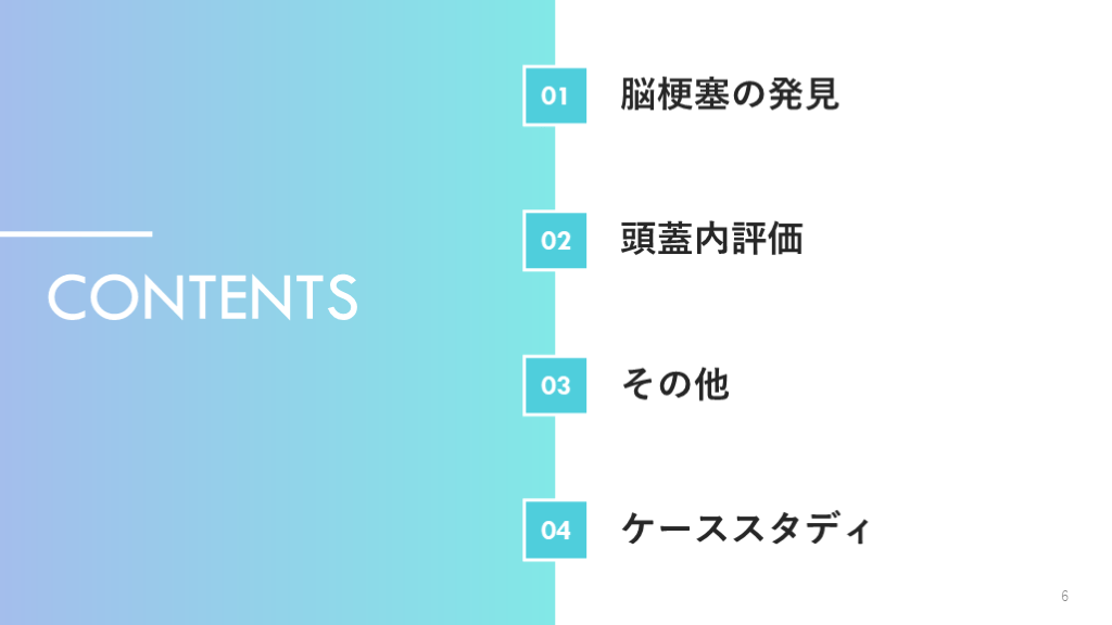 #6. 脳梗塞の発見 頭蓋内評価 その他 ケーススタディ 01 02 03 04 CONTENTS 6