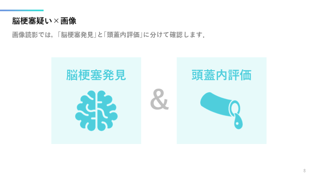 #8. 脳梗塞疑い×画像 画像読影では,「脳梗塞発見」と「頭蓋内評価」に分けて確認します. 8 脳梗塞発見