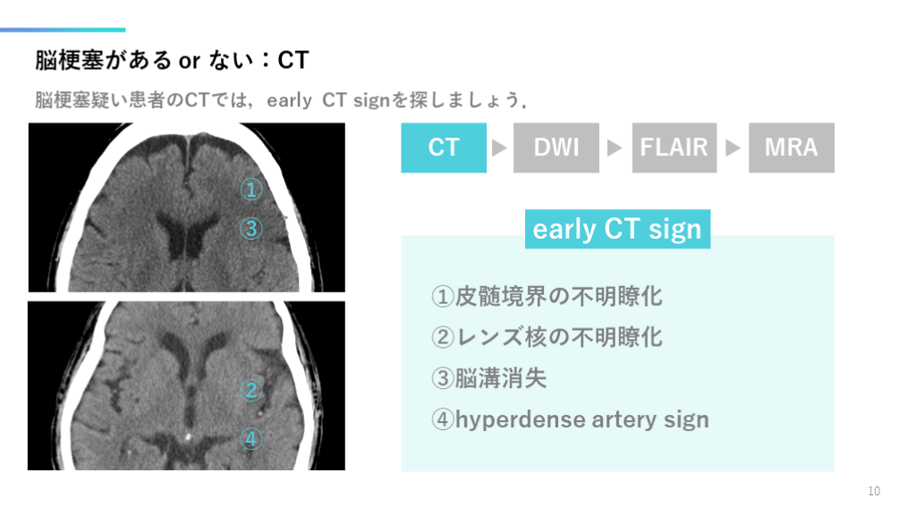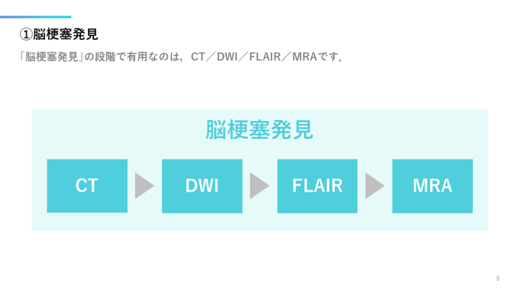 #9. ①脳梗塞発見 「脳梗塞発見」の段階で有用なのは,CT/DWI/FLAIR/MRAです. CT DWI FLAIR MRA 脳梗塞発見 9
