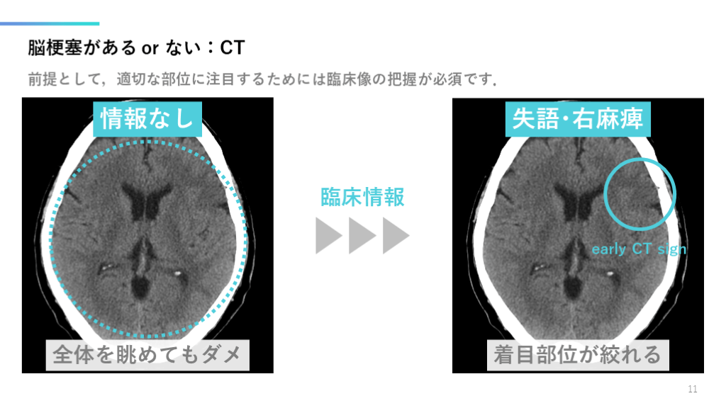 #11. 脳梗塞がある or ない:CT 前提として,適切な部位に注目するためには臨床像の把握が必須です. 着目部位が絞れる 全体を眺めてもダメ early CT sign 臨床情報 情報なし 失語・右麻痺 11