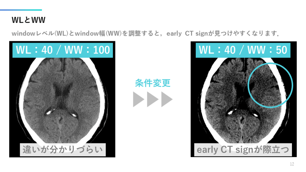 #12. WLとWW windowレベル(WL)とwindow幅(WW)を調整すると,early CT signが見つけやすくなります. 違いが分かりづらい early CT signが際立つ WL:40 / WW:100 WL:40 / WW:50 条件変更 12