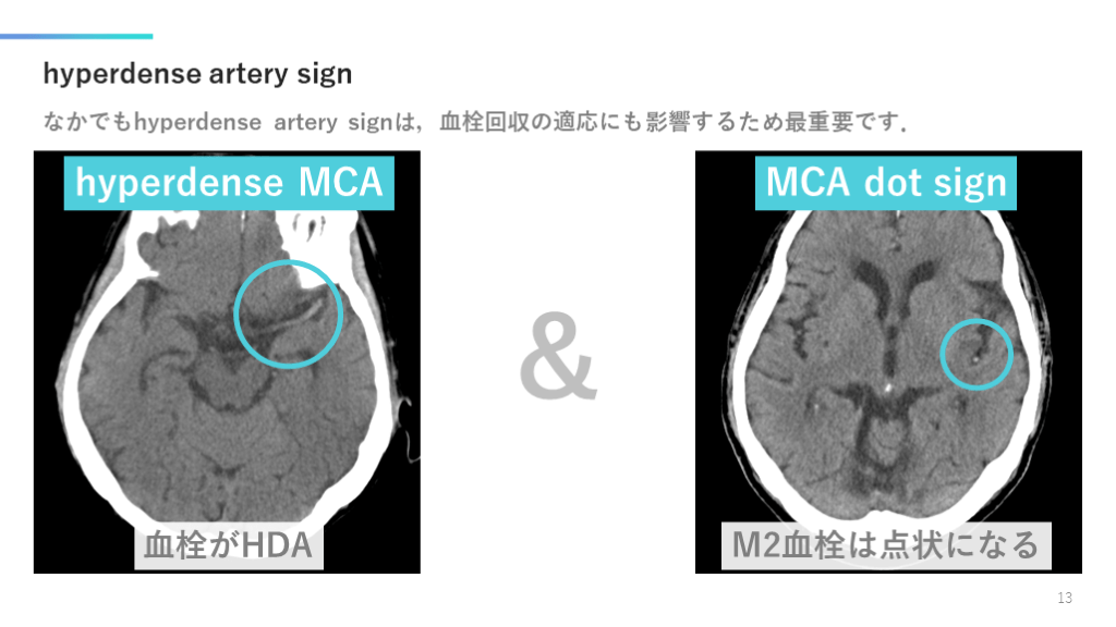 #13. hyperdense artery sign なかでもhyperdense artery signは,血栓回収の適応にも影響するため最重要です. & 血栓がHDA M2血栓は点状になる 13 hyperdense MCA MCA dot sign