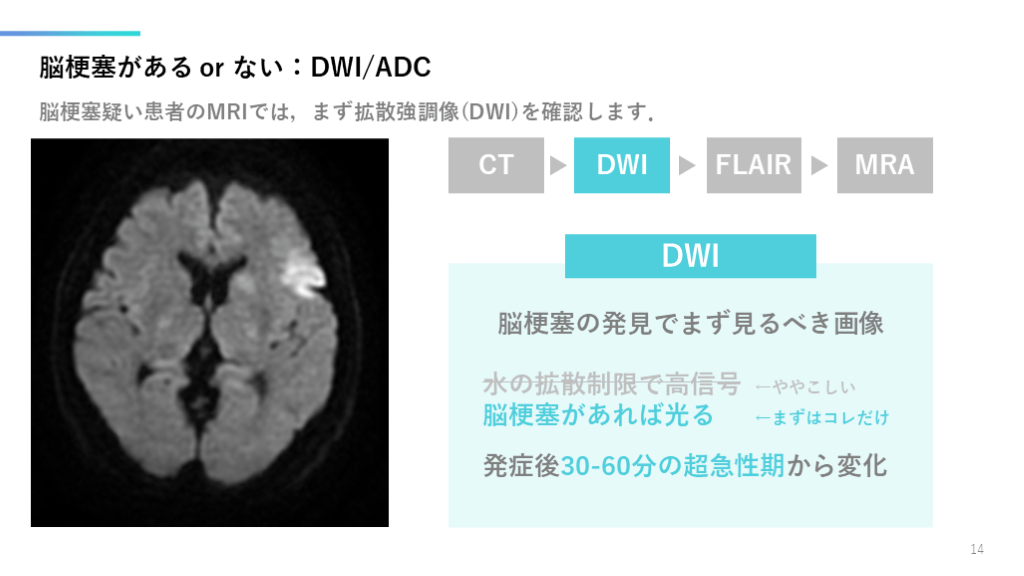 #14. 脳梗塞がある or ない:DWI/ADC 脳梗塞疑い患者のMRIでは,まず拡散強調像(DWI)を確認します. CT DWI FLAIR MRA 脳梗塞の発見でまず見るべき画像