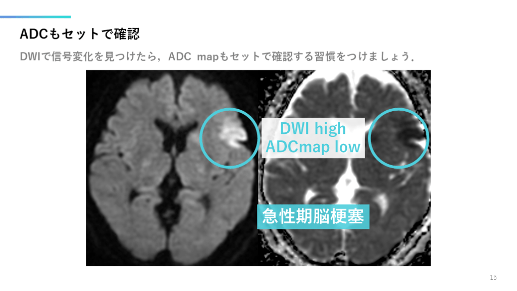 #15. ADCもセットで確認 DWIで信号変化を見つけたら,ADC mapもセットで確認する習慣をつけましょう. DWI high