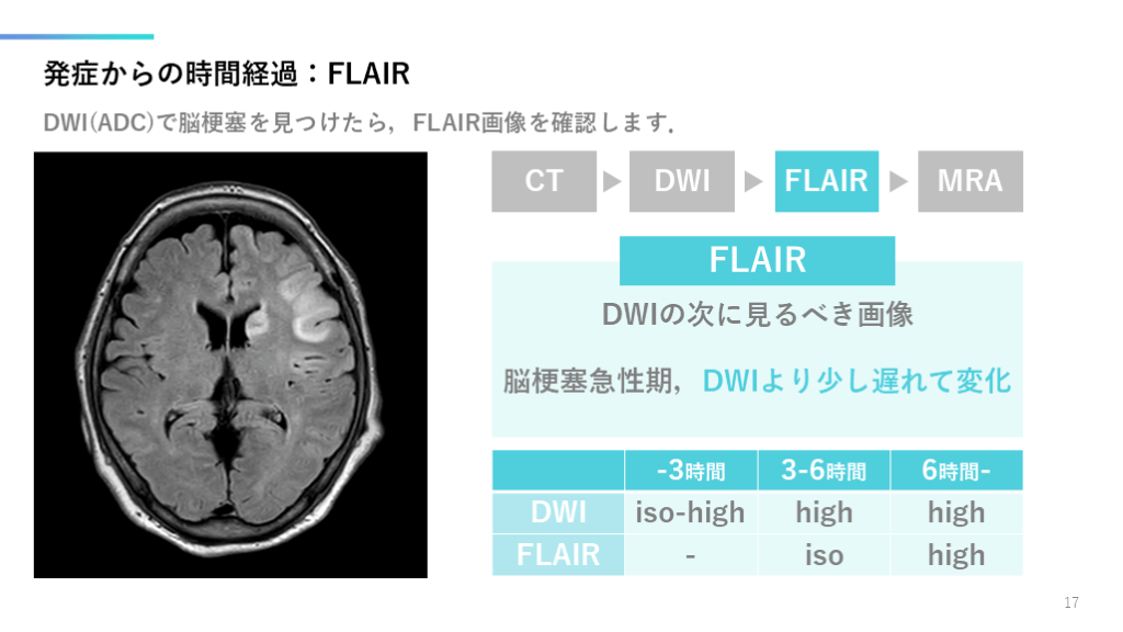 #17. 発症からの時間経過:FLAIR DWI(ADC)で脳梗塞を見つけたら,FLAIR画像を確認します. DWIの次に見るべき画像