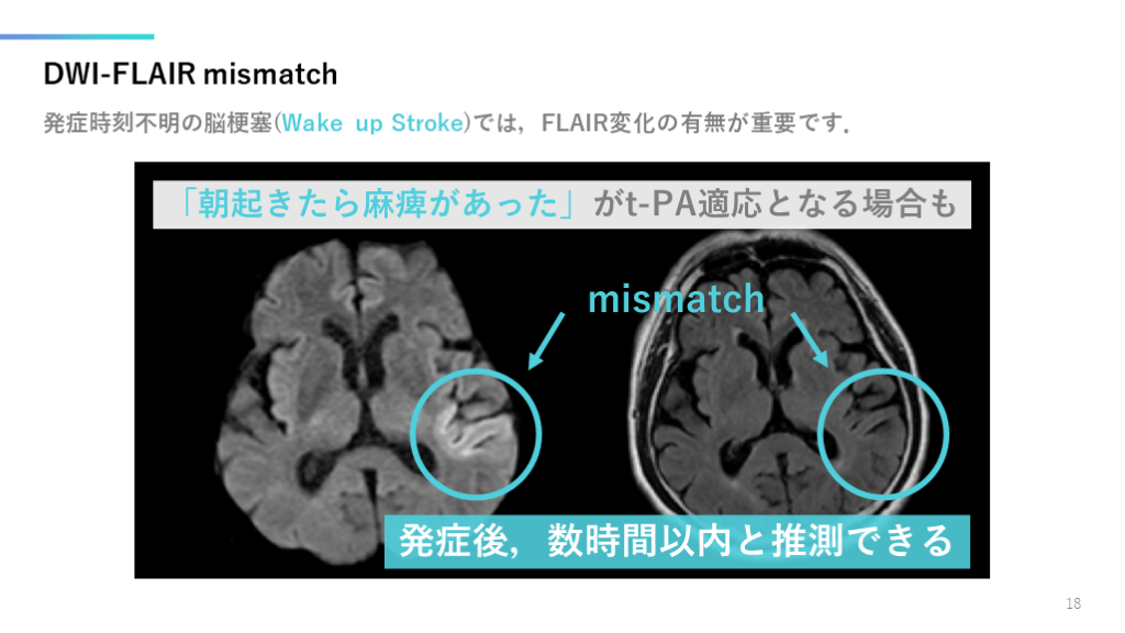 #18. DWI-FLAIR mismatch 発症時刻不明の脳梗塞(Wake up Stroke)では,FLAIR変化の有無が重要です. mismatch 発症後,数時間以内と推測できる 「朝起きたら麻痺があった」がt-PA適応となる場合も 18