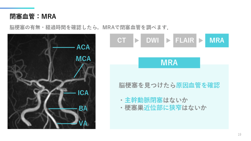 #19. 閉塞血管:MRA 脳梗塞の有無・経過時間を確認したら,MRAで閉塞血管を調べます. CT DWI FLAIR MRA 脳梗塞を見つけたら原因血管を確認