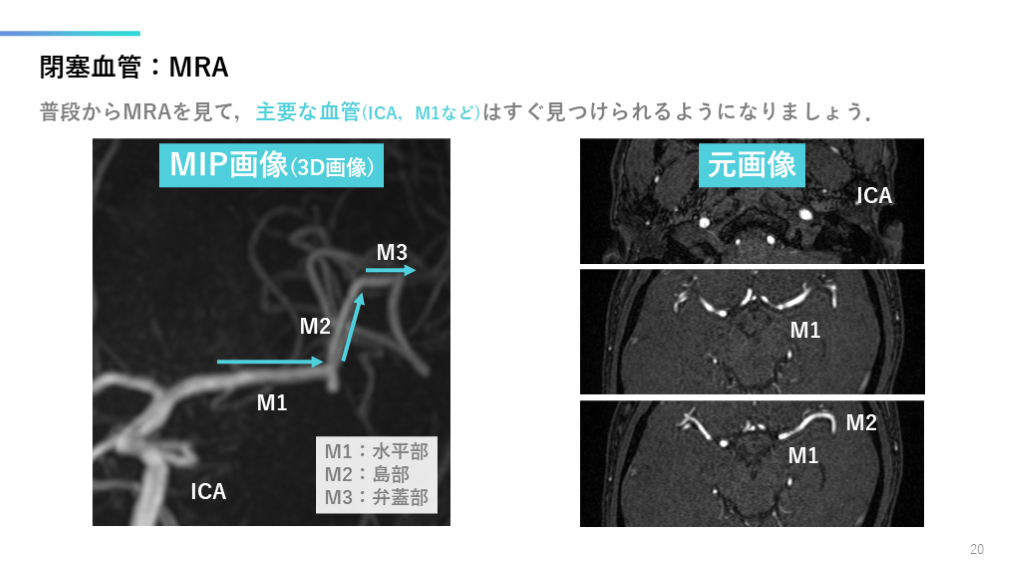#20. 閉塞血管:MRA 普段からMRAを見て,主要な血管(ICA,M1など)はすぐ見つけられるようになりましょう. M1 M2 M3 ICA M1 M1 M2 ICA M1:水平部