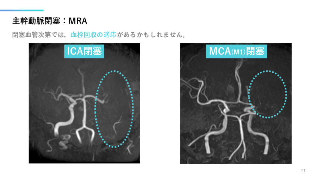 #21. 主幹動脈閉塞:MRA 閉塞血管次第では,血栓回収の適応があるかもしれません. MCA(M1)閉塞 ICA閉塞 21