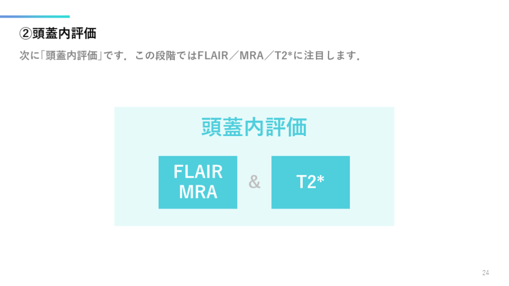 #24. ②頭蓋内評価 次に「頭蓋内評価」です.この段階ではFLAIR/MRA/T2*に注目します. FLAIR