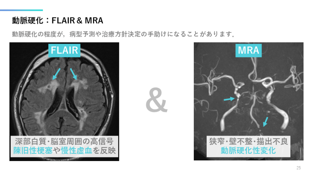 #25. 動脈硬化:FLAIR & MRA 動脈硬化の程度が,病型予測や治療方針決定の手助けになることがあります. 深部白質・脳室周囲の高信号