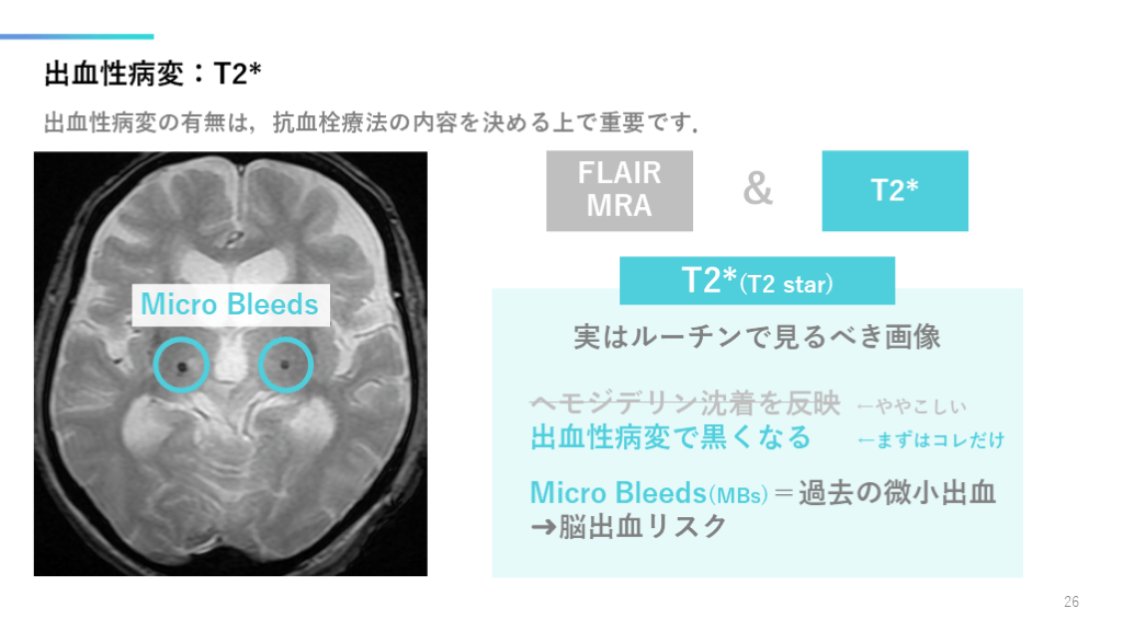 ➜脳出血リスク 出血性病変:T2*︎ 出血性病変の有無は,抗血栓療法の内容を決める上で重要です. T2*(T2 star) FLAIR