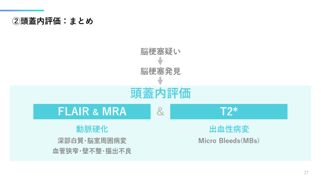 #27. ②頭蓋内評価:まとめ 頭蓋内評価 脳梗塞疑い 脳梗塞発見 27