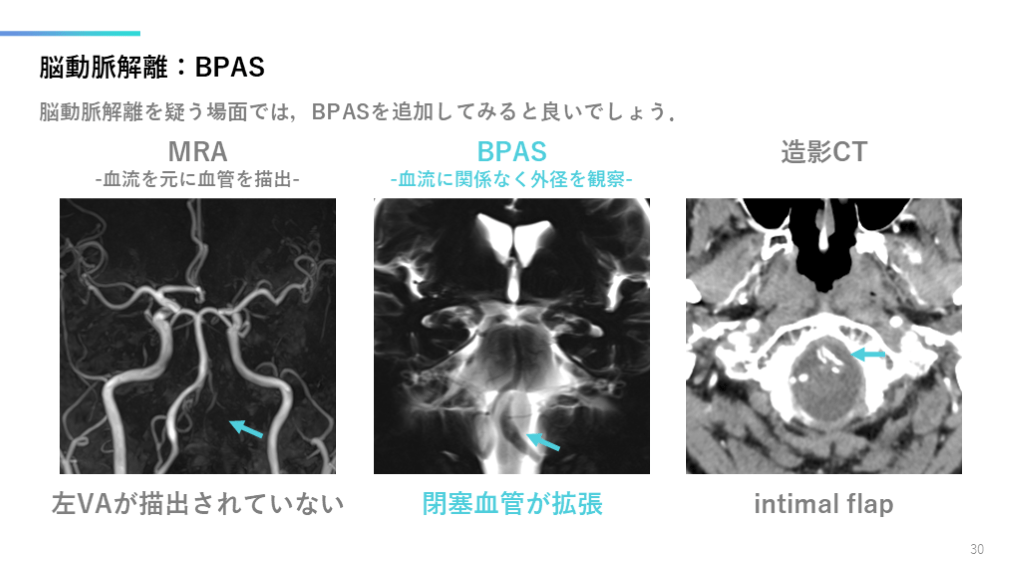 #30. 脳動脈解離:BPAS 脳動脈解離を疑う場面では,BPASを追加してみると良いでしょう. 左VAが描出されていない 閉塞血管が拡張 intimal flap BPAS