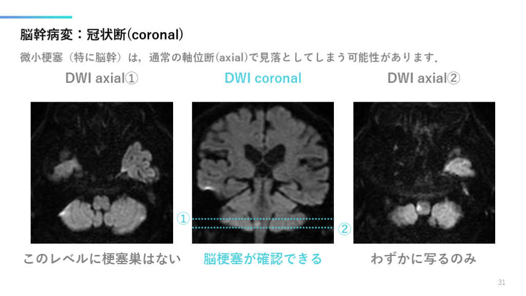 #31. 脳幹病変:冠状断(coronal) 微小梗塞(特に脳幹)は,通常の軸位断(axial)で見落としてしまう可能性があります. DWI coronal DWI axial① DWI axial② このレベルに梗塞巣はない 脳梗塞が確認できる わずかに写るのみ ① ② 31