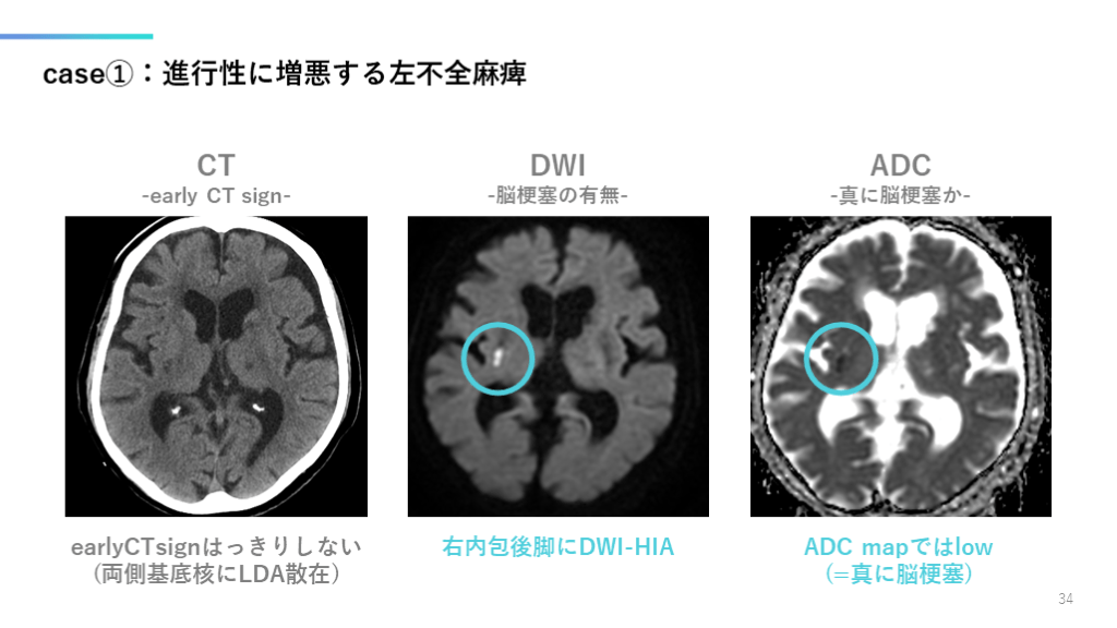 #34. case①:進行性に増悪する左不全麻痺 DWI