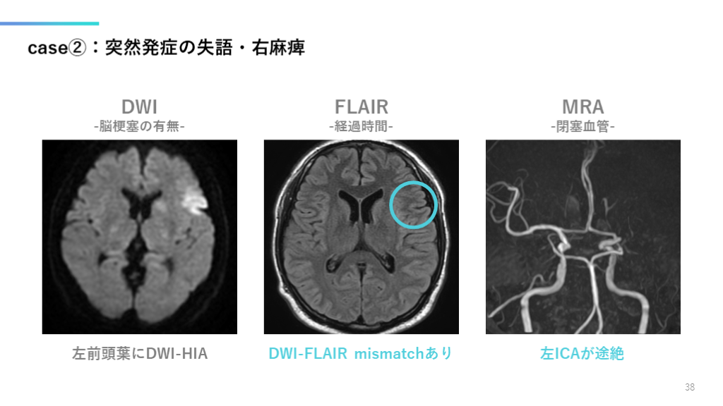 #38. case②:突然発症の失語・右麻痺 左前頭葉にDWI-HIA DWI-FLAIR mismatchあり 左ICAが途絶 38 FLAIR