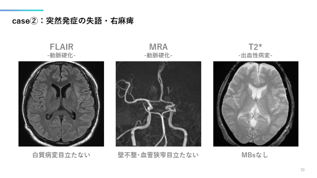 #39. case②:突然発症の失語・右麻痺 白質病変目立たない 壁不整・血管狭窄目立たない MBsなし 39 MRA