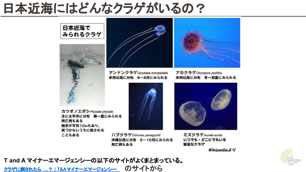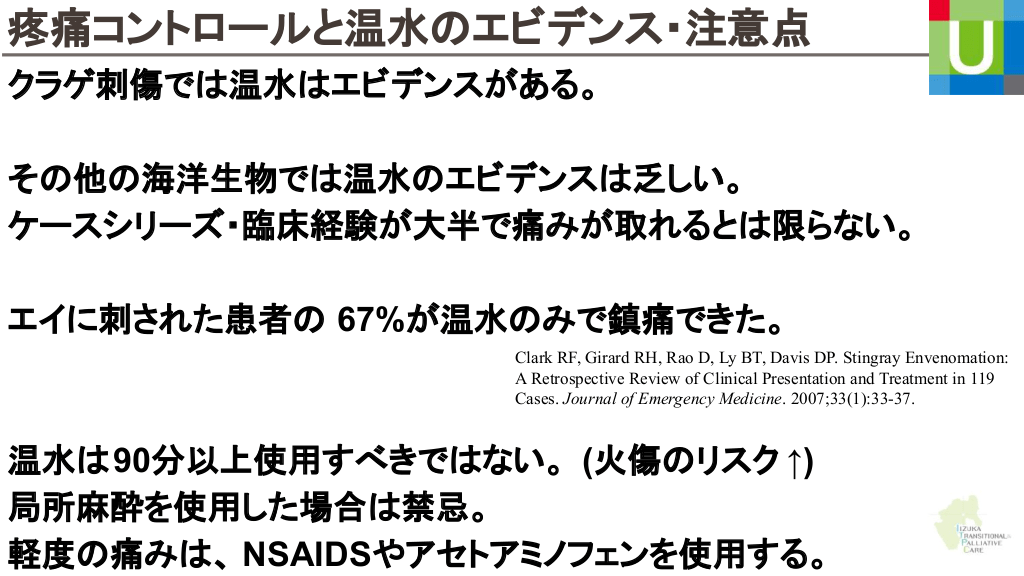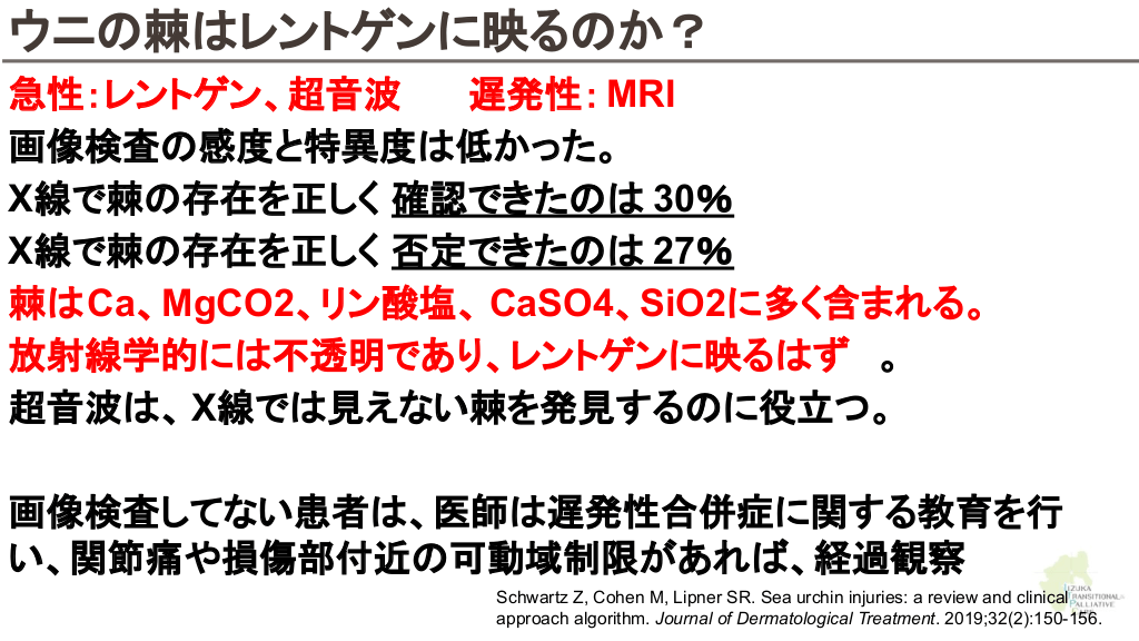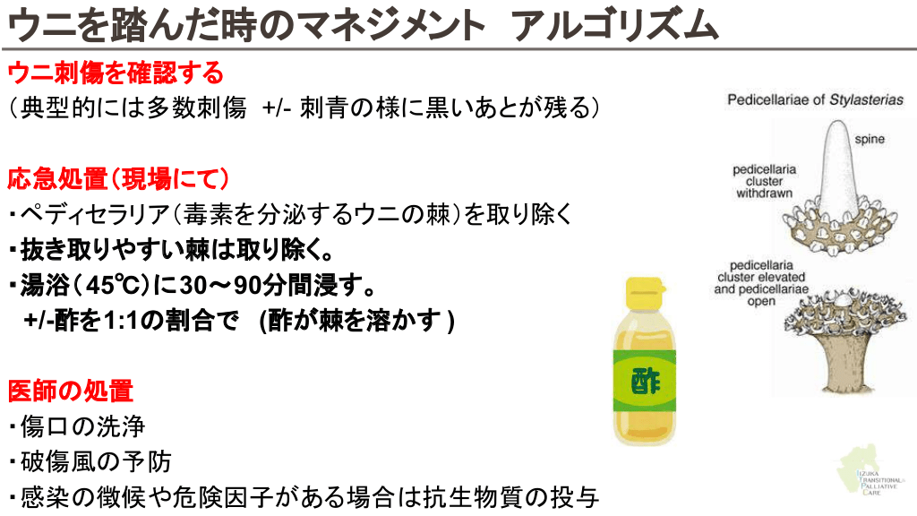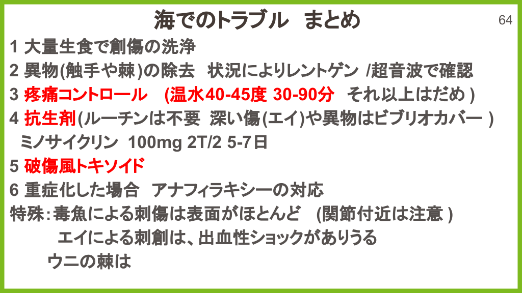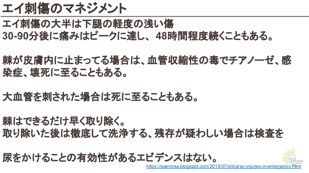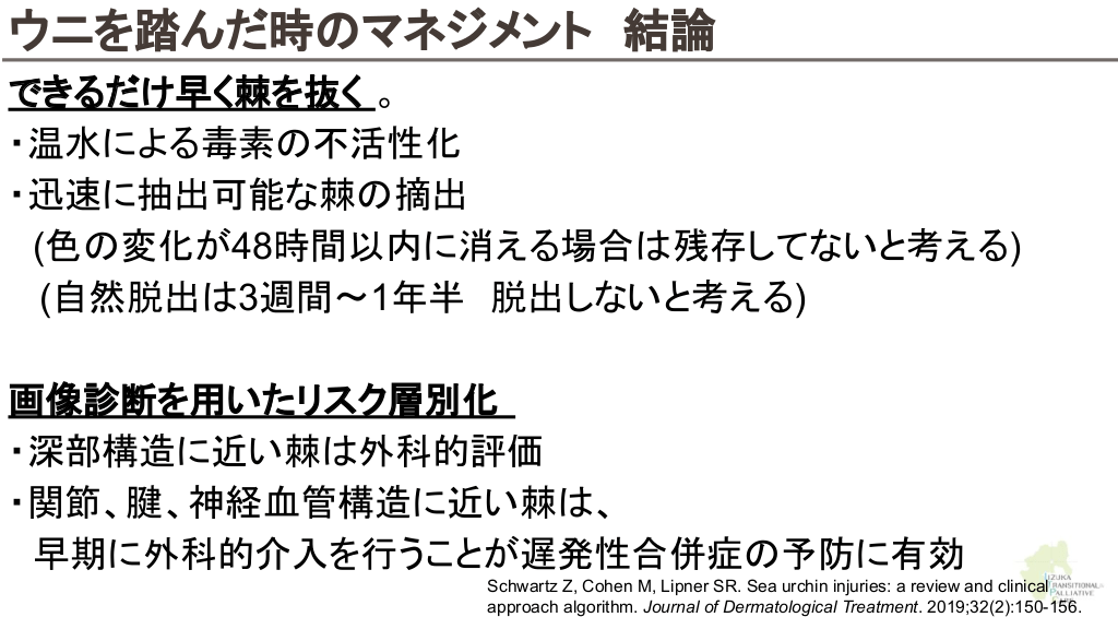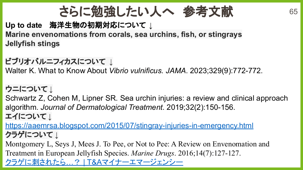 さらに勉強したい人へ 参考文献 Up to date 海洋生物 初期対応について ↓ Marine envenomations from corals, sea urchins, fish, or stingrays Jellyfish stings ビブリオバルニフィカスについて ↓ Walter K. What to Know About Vibrio vulnificus. JAMA. 2023;329(9):772-772. ウニについて ↓ Schwartz Z, Cohen M, Lipner SR. Sea urchin injuries: a review and clinical approach algorithm. Journal of Dermatological Treatment. 2019;32(2):150-156. エイについて ↓ https://aaemrsa.blogspot.com/2015/07/stingray-injuries-in-emergency.html クラゲについて ↓ Montgomery L, Seys J, Mees J. To Pee, or Not to Pee: A Review on Envenomation and Treatment in European Jellyfish Species. Marine Drugs. 2016;14(7):127-127. クラゲに刺されたら…? | T&Aマイナーエマージェンシー 65