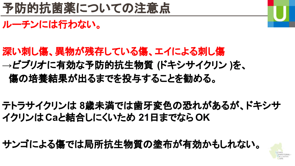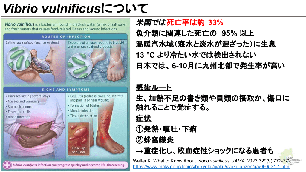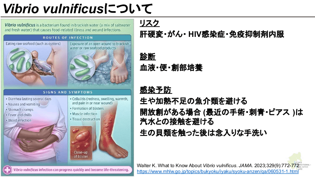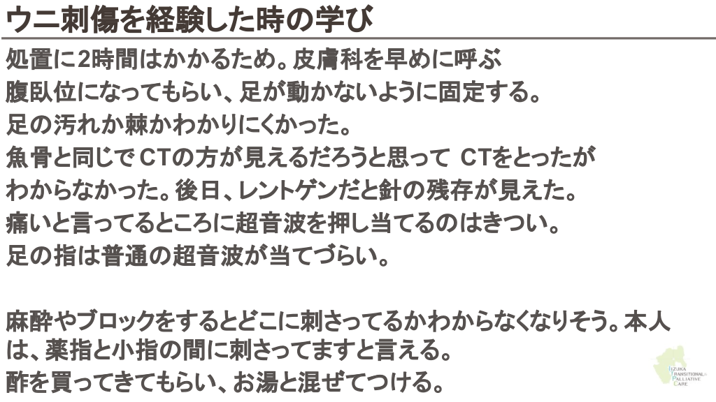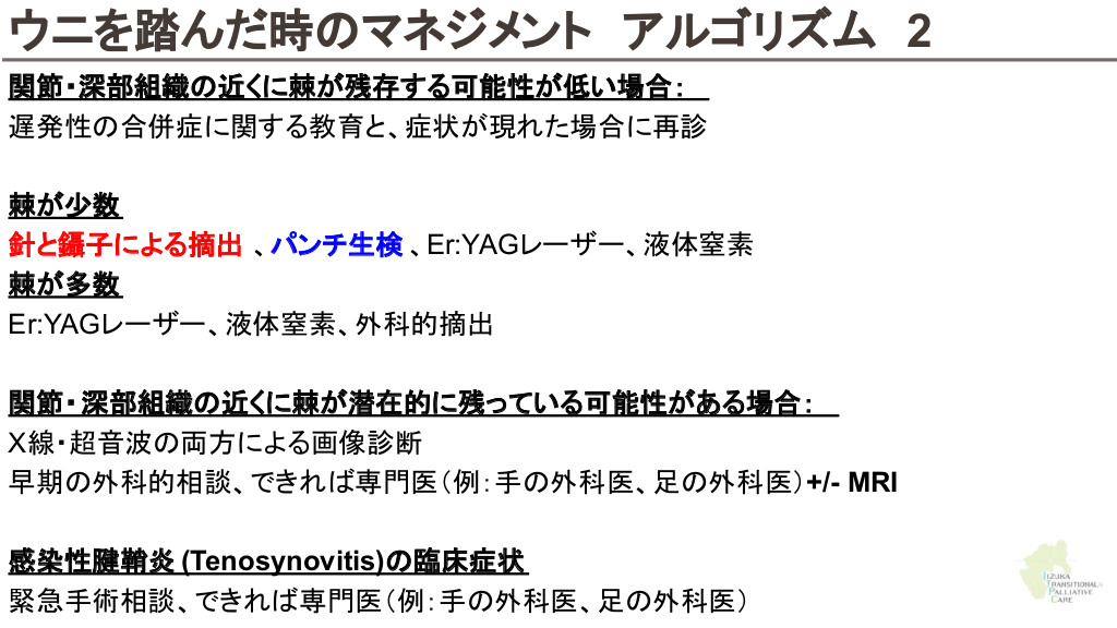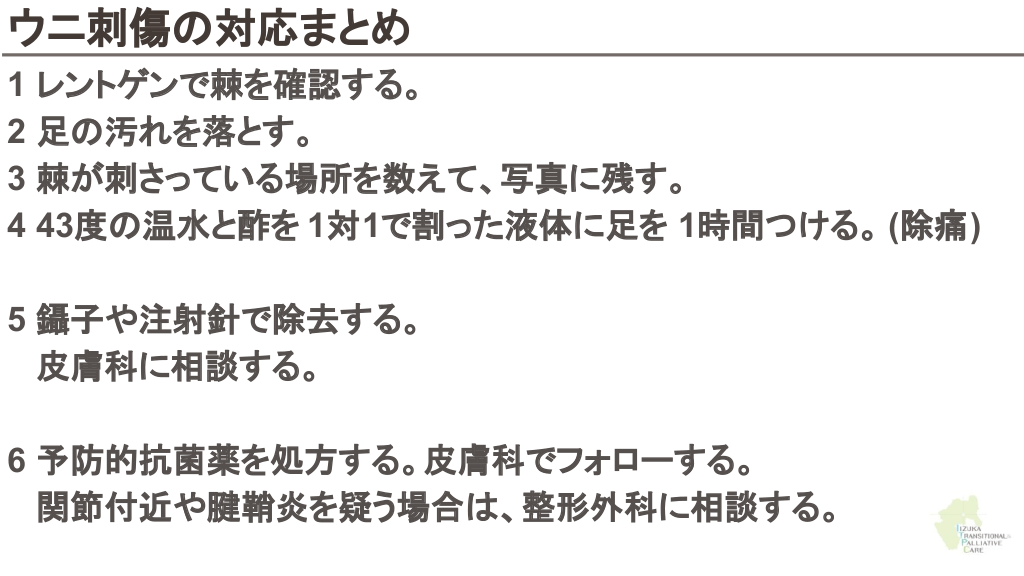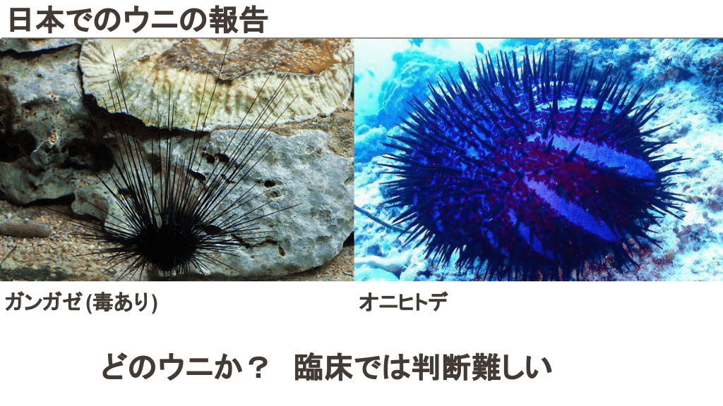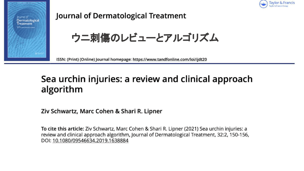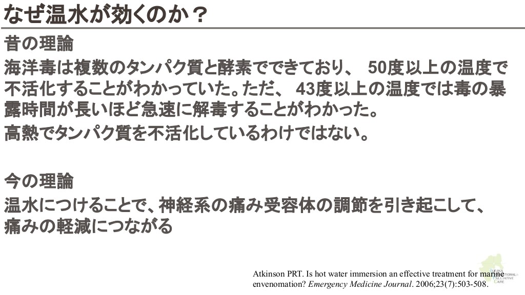 さらに勉強したい人へ 参考文献 Up to date 海洋生物 初期対応について ↓ Marine envenomations from corals, sea urchins, fish, or stingrays Jellyfish stings ビブリオバルニフィカスについて ↓ Walter K. What to Know About Vibrio vulnificus. JAMA. 2023;329(9):772-772. ウニについて ↓ Schwartz Z, Cohen M, Lipner SR. Sea urchin injuries: a review and clinical approach algorithm. Journal of Dermatological Treatment. 2019;32(2):150-156. エイについて ↓ https://aaemrsa.blogspot.com/2015/07/stingray-injuries-in-emergency.html クラゲについて ↓ Montgomery L, Seys J, Mees J. To Pee, or Not to Pee: A Review on Envenomation and Treatment in European Jellyfish Species. Marine Drugs. 2016;14(7):127-127. クラゲに刺されたら…? | T&Aマイナーエマージェンシー 65