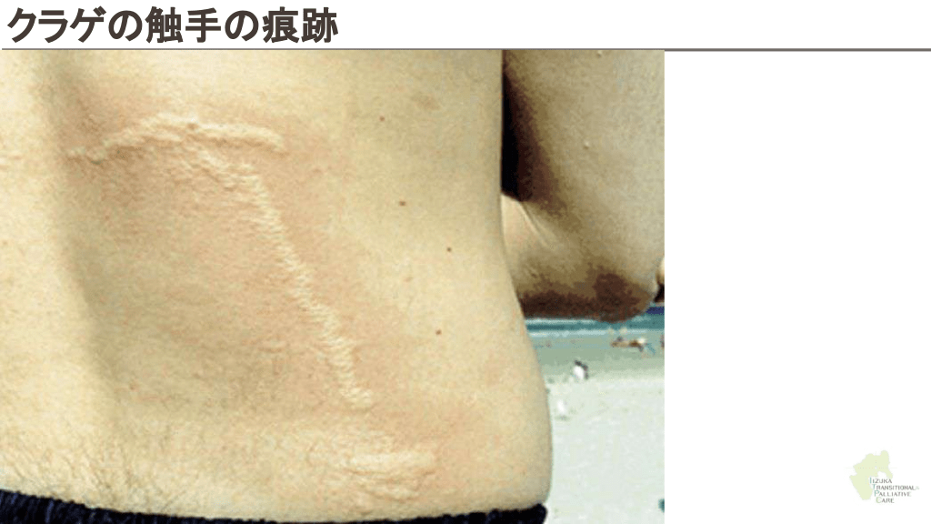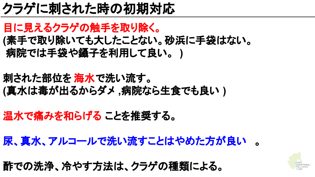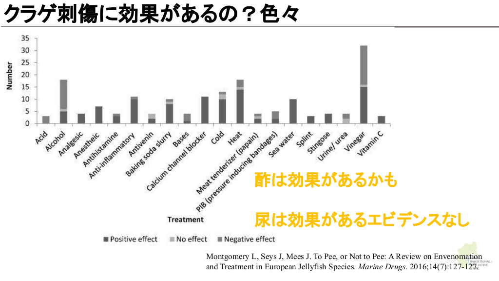 クラゲ刺傷に効果がある ?色々 酢 効果があるかも 尿 効果があるエビデンスなし Montgomery L, Seys J, Mees J. To Pee, or Not to Pee: A Review on Envenomation and Treatment in European Jellyfish Species. Marine Drugs. 2016;14(7):127-127.