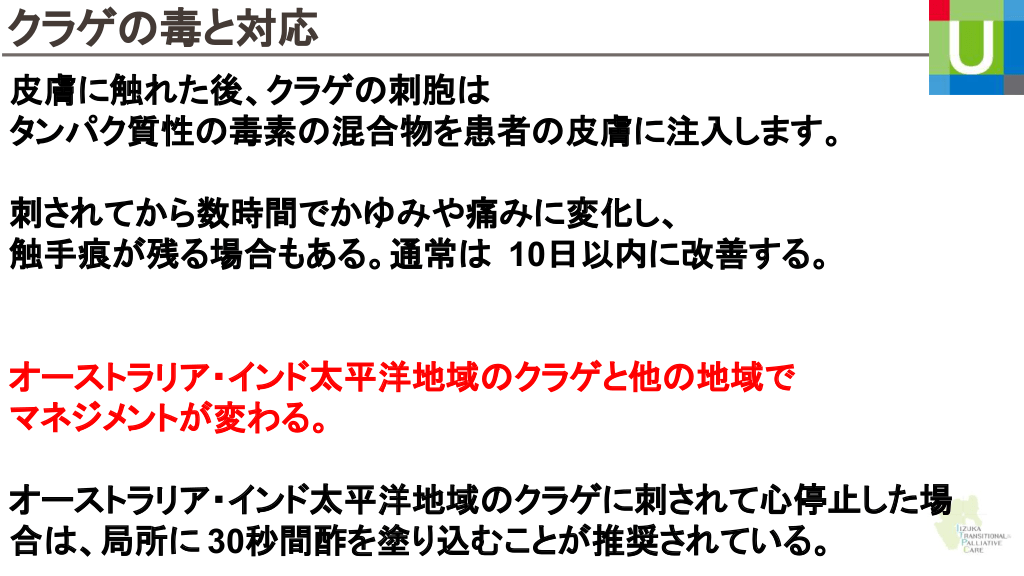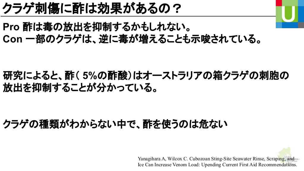 クラゲ刺傷に酢 効果がある ? Pro 酢 毒 放出を抑制するかもしれない。 Con 一部 クラゲ 、逆に毒が増えることも示唆されている。 研究によると、酢( 5% 酢酸) オーストラリア 放出を抑制することが分かっている。 クラゲ 種類がわからない中で、酢を使う 箱クラゲ 刺胞 危ない Yanagihara A, Wilcox C. Cubozoan Sting-Site Seawater Rinse, Scraping, and Ice Can Increase Venom Load: Upending Current First Aid Recommendations.