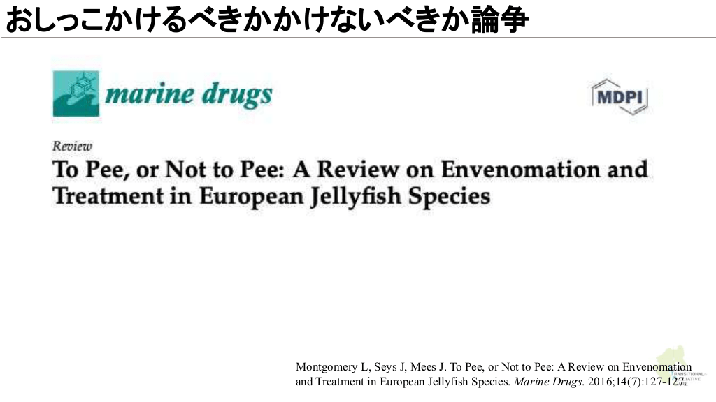 おしっこかけるべきかかけないべきか論争 Montgomery L, Seys J, Mees J. To Pee, or Not to Pee: A Review on Envenomation and Treatment in European Jellyfish Species. Marine Drugs. 2016;14(7):127-127.