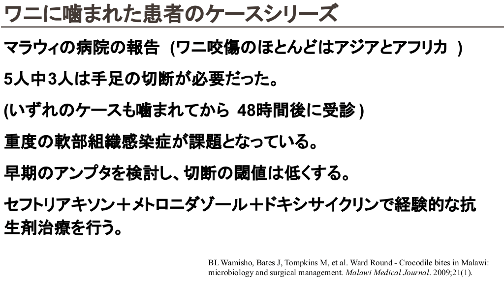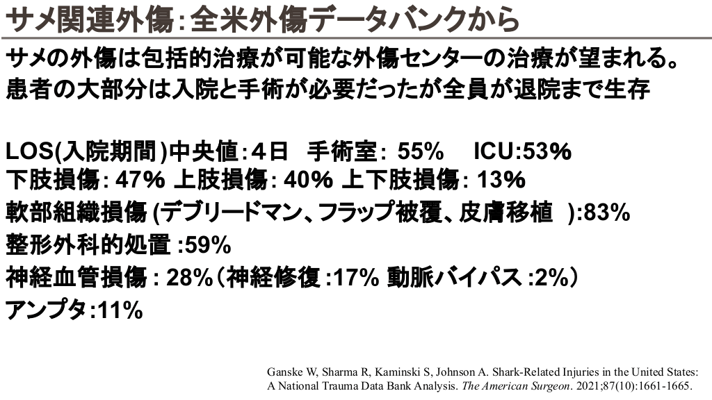 サメ関連外傷:全米外傷データバンクから サメ 外傷 包括的治療が可能な外傷センター 治療が望まれる。 患者 大部分 入院と手術が必要だったが全員が退院まで生存 LOS(入院期間 )中央値:4日 手術室: 55% ICU:53% 下肢損傷: 47% 上肢損傷: 40% 上下肢損傷: 13% 軟部組織損傷 (デブリードマン、フラップ被覆、皮膚移植 ):83% 整形外科的処置 :59% 神経血管損傷 : 28%(神経修復 :17% 動脈バイパス :2%) アンプタ :11% Ganske W, Sharma R, Kaminski S, Johnson A. Shark-Related Injuries in the United States: A National Trauma Data Bank Analysis. The American Surgeon. 2021;87(10):1661-1665.