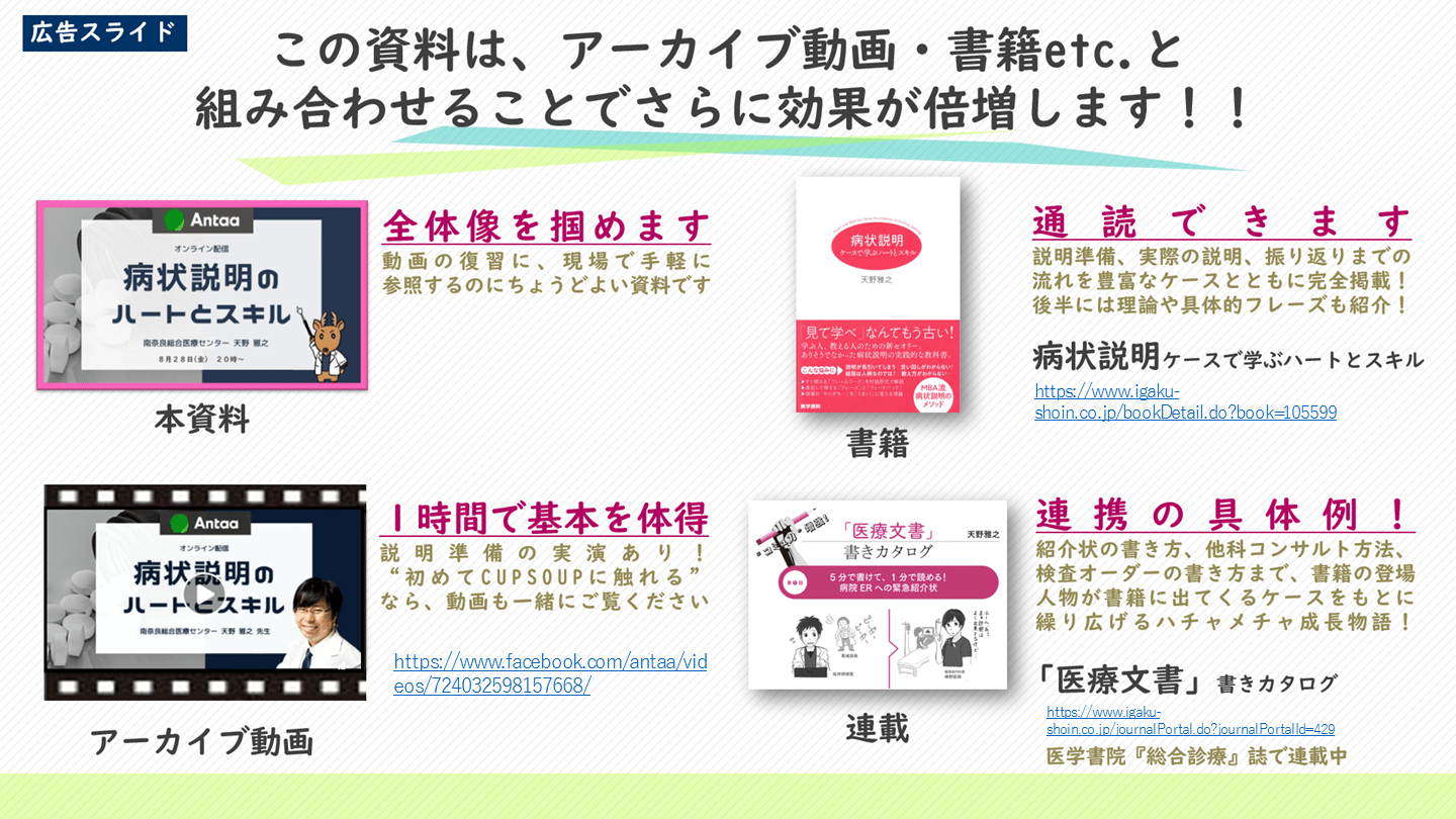また、書籍自体は実践編&理論編の2本立てで、「病状説明」をわかりやすく体系的に学べますので、併せてご参照ください(^^)