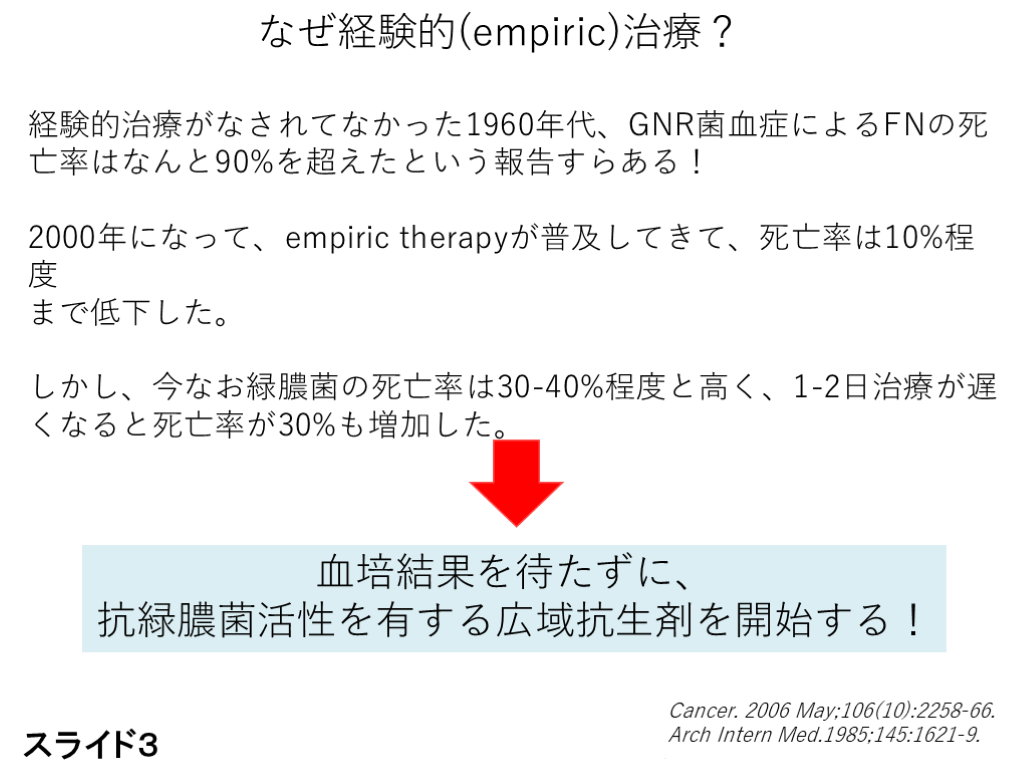 #3. なぜ経験的(empiric)治療? 経験的治療がなされてなかった1960年代、GNR菌血症によるFNの死亡率はなんと90%を超えたという報告すらある!