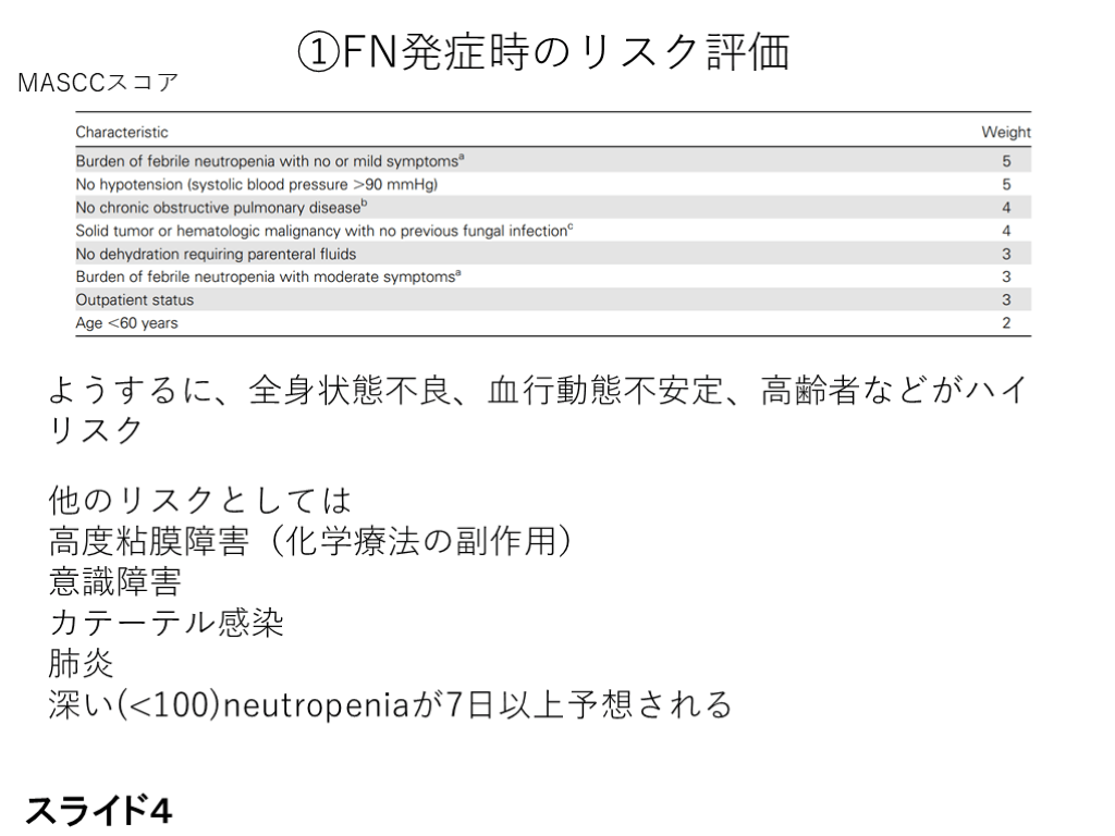 #4. ①FN発症時のリスク評価 ようするに、全身状態不良、血行動態不安定、高齢者などがハイリスク MASCCスコア 他のリスクとしては