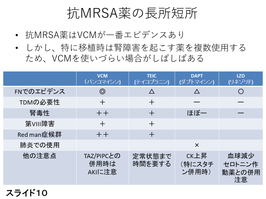#10. 抗MRSA薬の長所短所 抗MRSA薬はVCMが一番エビデンスあり