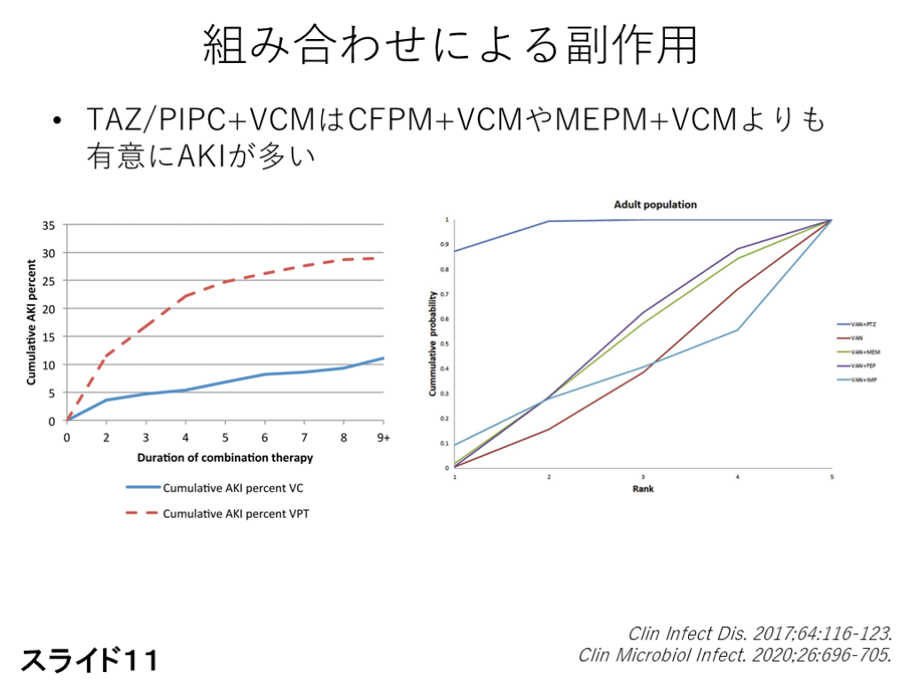 Clin Microbiol Infect. 2020;26:696-705. TAZ/PIPC+VCMはCFPM+VCMやMEPM+VCMよりも有意にAKIが多い スライド11