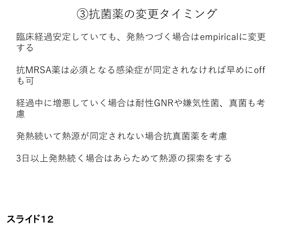 #12. ③抗菌薬の変更タイミング 臨床経過安定していても、発熱つづく場合はempiricalに変更する
