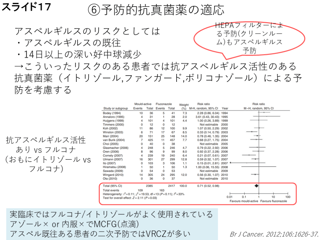 (おもにイトリゾール vs フルコナ) Br J Cancer. 2012;106:1626-37. HEPAフィルターによる予防(クリーンルーム)もアスペルギルス予防 実臨床ではフルコナ/イトリゾールがよく使用されている