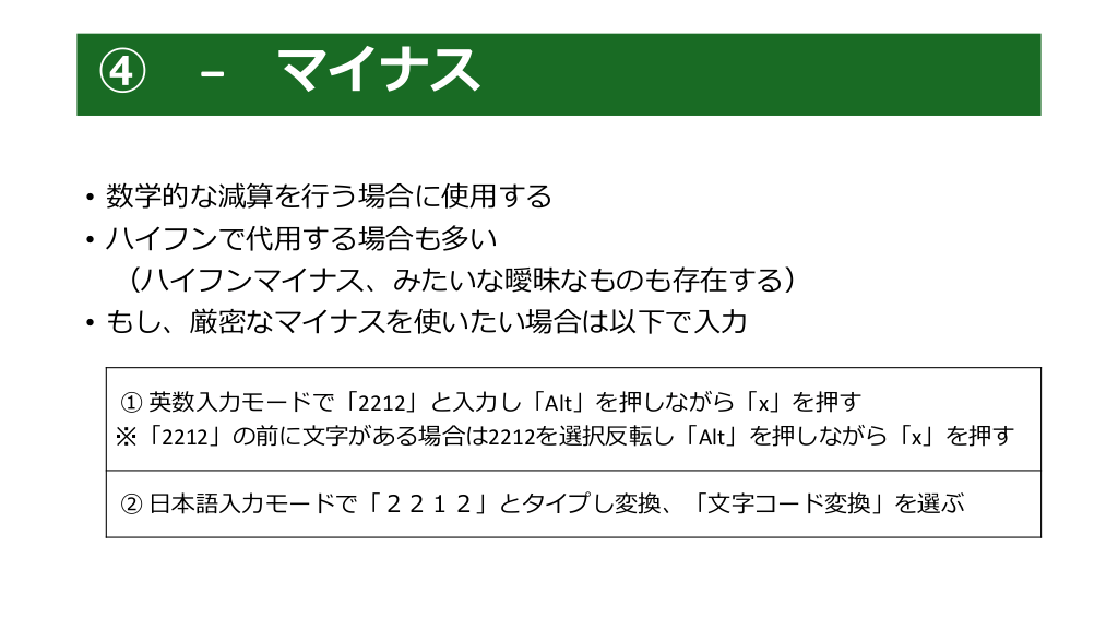 #10. ④ − マイナス • 数学的な減算を行う場合に使用する • ハイフンで代用する場合も多い (ハイフンマイナス、みたいな曖昧なものも存在する) • もし、厳密なマイナスを使いたい場合は以下で入力 ① 英数入力モードで「2212」と入力し「Alt」を押しながら「x」を押す ※「2212」の前に文字がある場合は2212を選択反転し「Alt」を押しながら「x」を押す ② 日本語入力モードで「2212」とタイプし変換、「文字コード変換」を選ぶ