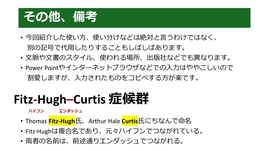 #11. その他、備考 • 今回紹介した使い方、使い分けなどは絶対と言うわけではなく、 別の記号で代用したりすることもしばしばあります。 • 文脈や文書のスタイル、使われる場所、出版社などでも異なります。 • Power Pointやインターネットブラウザなどでの入力はややこしいので 割愛しますが、入力されたものをコピペする方が楽です。 Fitz-Hugh–Curtis 症候群 ハイフン エンダッシュ • Thomas Fitz-Hugh氏、Arthur Hale Curtis氏にちなんで命名 • Fitz-Hughは複合名であり、元々ハイフンでつながれている。 • 両者の名前は、前述通りエンダッシュでつながれる。