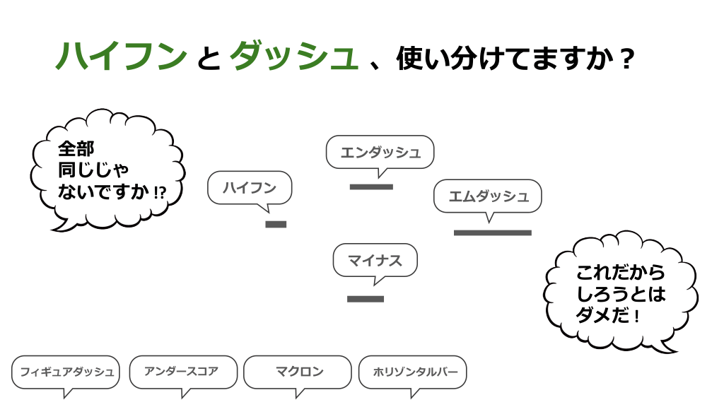 #2. ハイフン と ダッシュ 、使い分けてますか? 全部 同じじゃ ないですか !? – — − エンダッシュ ハイフン エムダッシュ マイナス フィギュアダッシュ アンダースコア マクロン ホリゾンタルバー これだから しろうとは ダメだ !