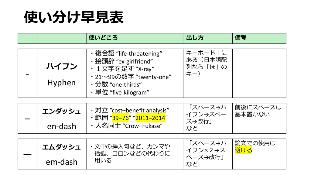 #3. 使い分け早見表 - – — ハイフン Hyphen エンダッシュ en-dash エムダッシュ em-dash 使いどころ 出し方 備考 ・複合語 “life-threatening” ・接頭辞 “ex-girlfriend” ・1文字を足す “X-ray” ・21~99の数字 “twenty-one” ・分数 “one-thirds” ・単位 “five-kilogram” キーボード上に ある(日本語配 列なら「ほ」の キー) ・対立 ”cost–benefit analysis” ・範囲 “39–76” “2011–2014” ・人名同士 “Crow–Fukase” 「スペース→ハ イフン→スペー ス→改行」 など 前後にスペースは 基本置かない ・文中の挿入句など、カンマや 括弧、コロンなどの代わりに 用いる 「スペース→ハ イフン×2→ス ペース→改行」 など 論文での使用は 避ける