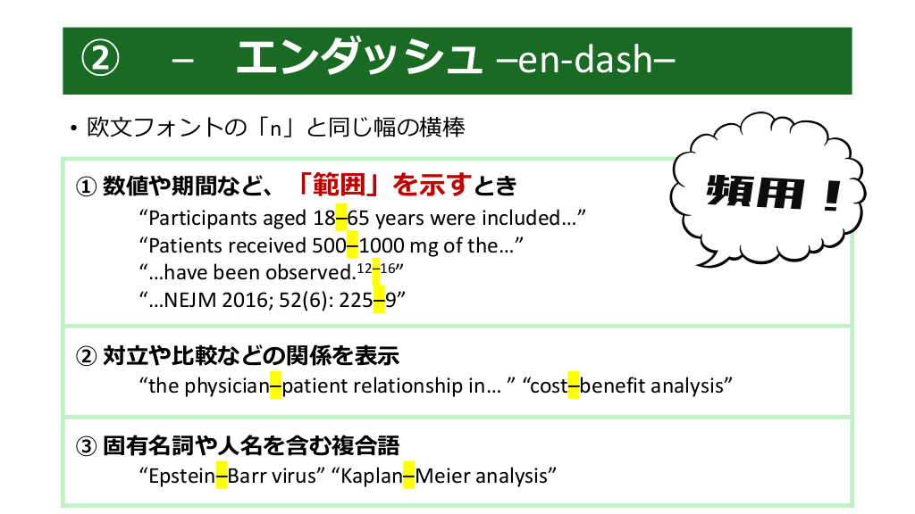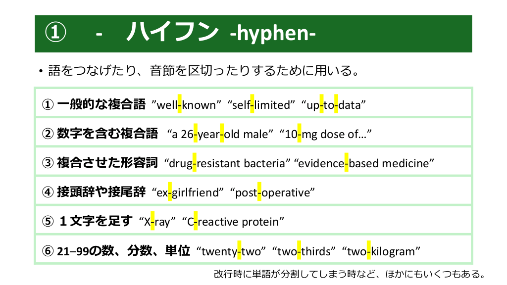 #4. ① - ハイフン -hyphen- • 語をつなげたり、音節を区切ったりするために用いる。 ① 一般的な複合語 ”well-known” “self-limited” “up-to-data” ② 数字を含む複合語 “a 26-year-old male” “10-mg dose of…” ③ 複合させた形容詞 “drug-resistant bacteria” “evidence-based medicine” ④ 接頭辞や接尾辞 “ex-girlfriend” “post-operative” ⑤ 1文字を足す “X-ray” “C-reactive protein” ⑥ 21–99の数、分数、単位 “twenty-two” “two-thirds” “two-kilogram” 改行時に単語が分割してしまう時など、ほかにもいくつもある。
