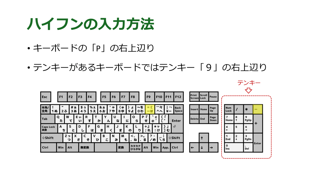 #5. ハイフンの入力方法 • キーボードの「P」の右上辺り • テンキーがあるキーボードではテンキー「9」の右上辺り テンキー