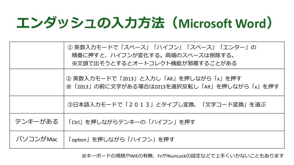 #7. エンダッシュの入力方法(Microsoft Word) ① 英数入力モードで「スペース」「ハイフン」「スペース」「エンター」の 順番に押すと、ハイフンが変化する。両端のスペースは削除する。 ※文頭で出そうとするとオートコレクト機能が邪魔することがある ② 英数入力モードで「2013」と入力し「Alt」を押しながら「x」を押す ※「2013」の前に文字がある場合は2013を選択反転し「Alt」を押しながら「x」を押す ③日本語入力モードで「2013」とタイプし変換、「文字コード変換」を選ぶ テンキーがある 「Ctrl」を押しながらテンキーの「ハイフン」を押す パソコンがMac 「option」を押しながら「ハイフン」を押す ※キーボードの規格やIMEの有無、FnやNumLockの設定などで上手くいかないこともあります
