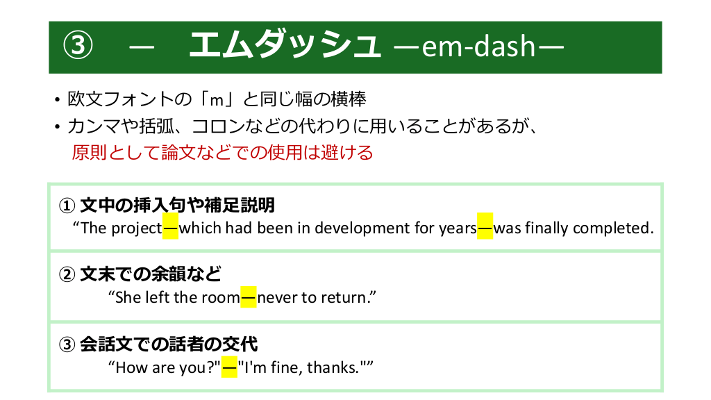 #8. ③ — エムダッシュ —em-dash— • 欧文フォントの「m」と同じ幅の横棒 • カンマや括弧、コロンなどの代わりに用いることがあるが、 原則として論文などでの使用は避ける ① 文中の挿入句や補足説明 “The project—which had been in development for years—was finally completed. ② 文末での余韻など “She left the room—never to return.” ③ 会話文での話者の交代 “How are you?"—"I'm fine, thanks."”